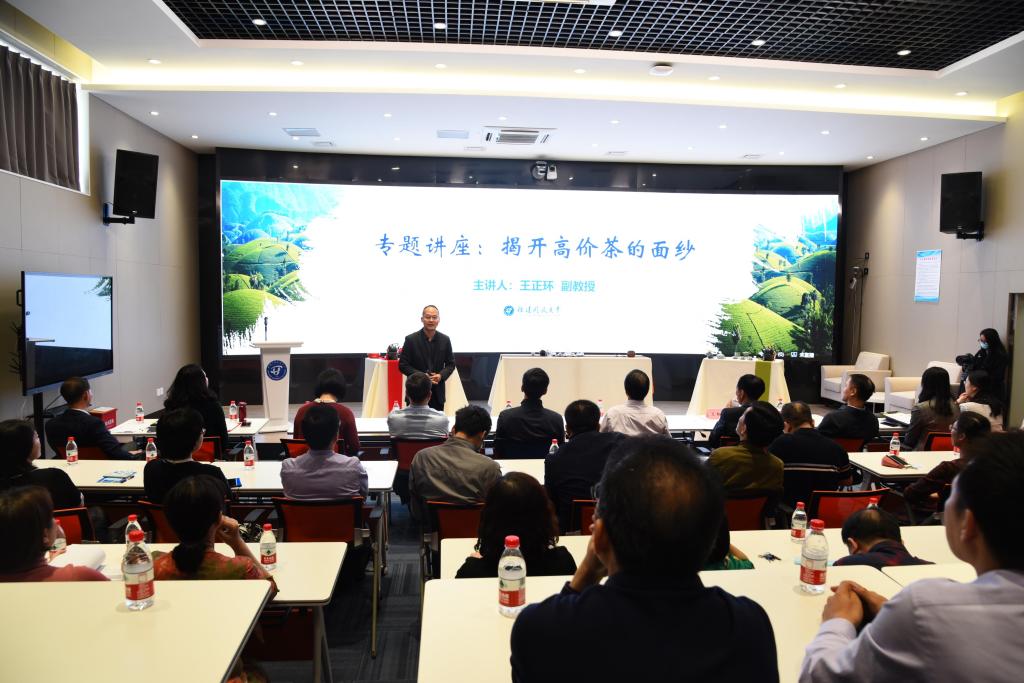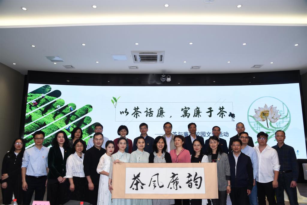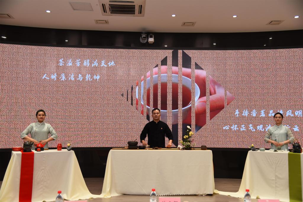 文经学院茶专业主任、副教授王正环作了关于“揭开天价茶的面纱”的专题讲座。他从茶的成分、健康功效、产地、工艺等方面出发,分析茶叶价格的影响因素,梳理 “天价茶”形成的内在逻辑和危害,引导大家辨析不同等级、不同质量的茶品及其差异,并倡导形成理性、健康的饮茶风气,不助长奢靡之风。内容丰富、深入浅出,结合茶的盲品互动游戏,活跃现场氛围的同时使大家对茶的价格与品质联系、如何选购适合的茶有了更深刻的理解。文经学院茶文化表演队还带来精彩的“茶风廉韵”茶艺表演。取茶、注水、冲泡、闻香、品饮……精致的茶席、精湛的茶艺,配上清幽的音乐和娓娓动听的解说,生动演绎了寓廉于茶、润物无声的茶廉文化,让大家耳目一新。尾声处一幅“茶风廉韵”书法作品徐徐展开,为表演画上点睛之笔。