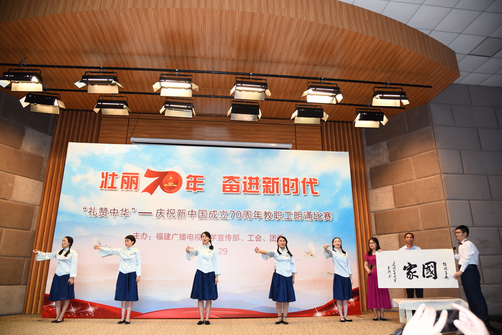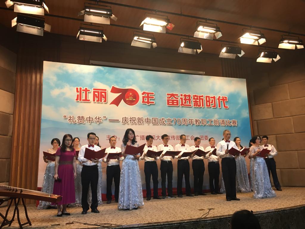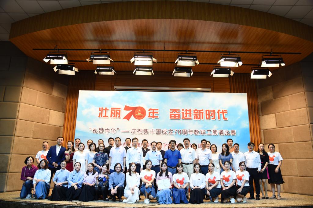 为庆祝中华人民共和国成立70周年,结合“不忘初心、牢记使命”主题教育,9月29日下午,学校在桂山校区举办“礼赞中华”—庆祝中华人民共和国成立70周年教职工朗诵比赛。校领导陈兴炎、吴国荣、马成斌、陈展虹、沈光辉、王幼新与现场近200名教职工一起观看了比赛。