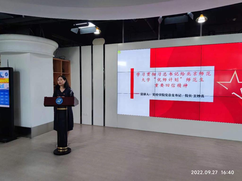 9月27日下午,文经学院党总支以“学习回信精神,争做’四有’好老师”为主题,组织学习习近平总书记给北京师范大学“优师计划”师范生重要回信精神,并结合学院办学实际交流学习体会。会议由总支书记王妙真主持,全体党员参加。