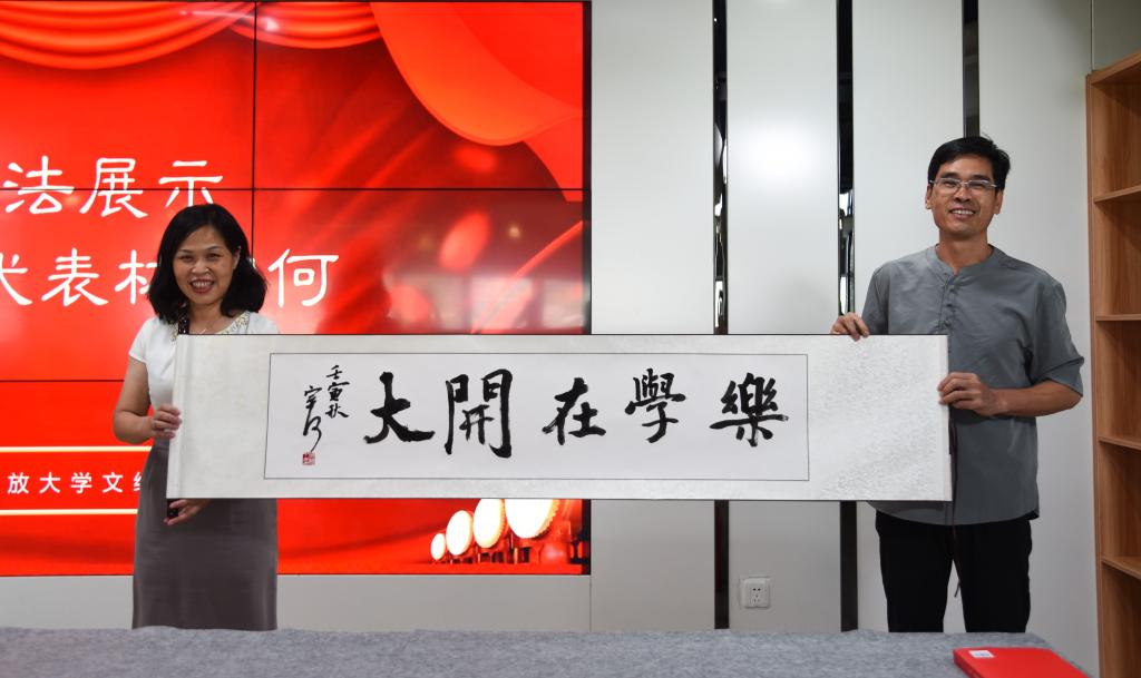 本次入学教育围绕“乐学”的活动主题,通过沉浸式的互动体验,为新同学们介绍了进入福建开放大学后,学思想、学知识、学技能、学文化、学校史等五个板块的学习内容。学院党总支为新同学们赠送了《闽山闽水物华新——习近平总书记福建足迹》一书,党员教师雷心恬作领学分享,她鼓励同学们在校期间认真学习习近平新时代中国特色社会主义思想,树立远大理想,明确人生目标,积极向党组织靠拢,走好自己的人生路。教学教务科梁晨老师为新生做“一网一平台”使用培训,并勉励同学们充分利用开放大学海量的网络学习资源,用好平台学习,丰富知识储备,提升职业能力。全省开放大学优秀学生干部、2020秋茶艺与茶叶营销专业王芳同学作茶席和茶艺课程学习成果展示,并鼓励同学们积极加入学院学生社团,参与各类创新创业和校园文化活动,提升综合素养。新生代表、2022秋书法学本科专业林宗何同学现场书写了“乐学在开大”的卷轴,并将其赠送给学院,他号召同学们积极参与面授课程学习和社会实践活动,加深了解,增进友谊,学有所成。