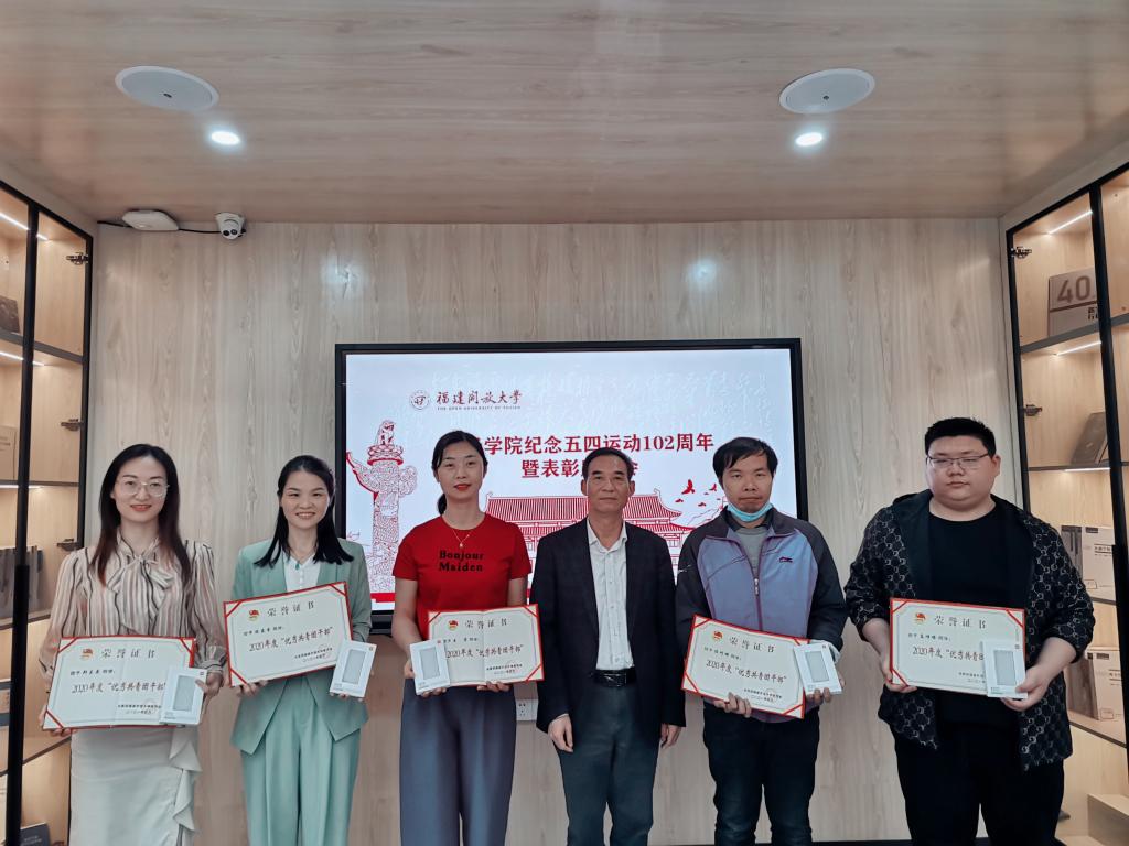 会上,黄生春代表学校团委宣读了《关于表彰共青团福建开放大学委员会2020年度先进集体和先进个人的决定》,文经学院王芳等6位同学被授予“2020年度福建开放大学优秀共青团干部”荣誉称号,陈桂植等10位同学被授予“2020年度福建开放大学优秀共青团员”荣誉称号。刘玉兴、黄生春、王妙真为受表彰的同学颁发获奖证书及奖品,并为同学们赠送《习近平与大学生朋友们》书籍。