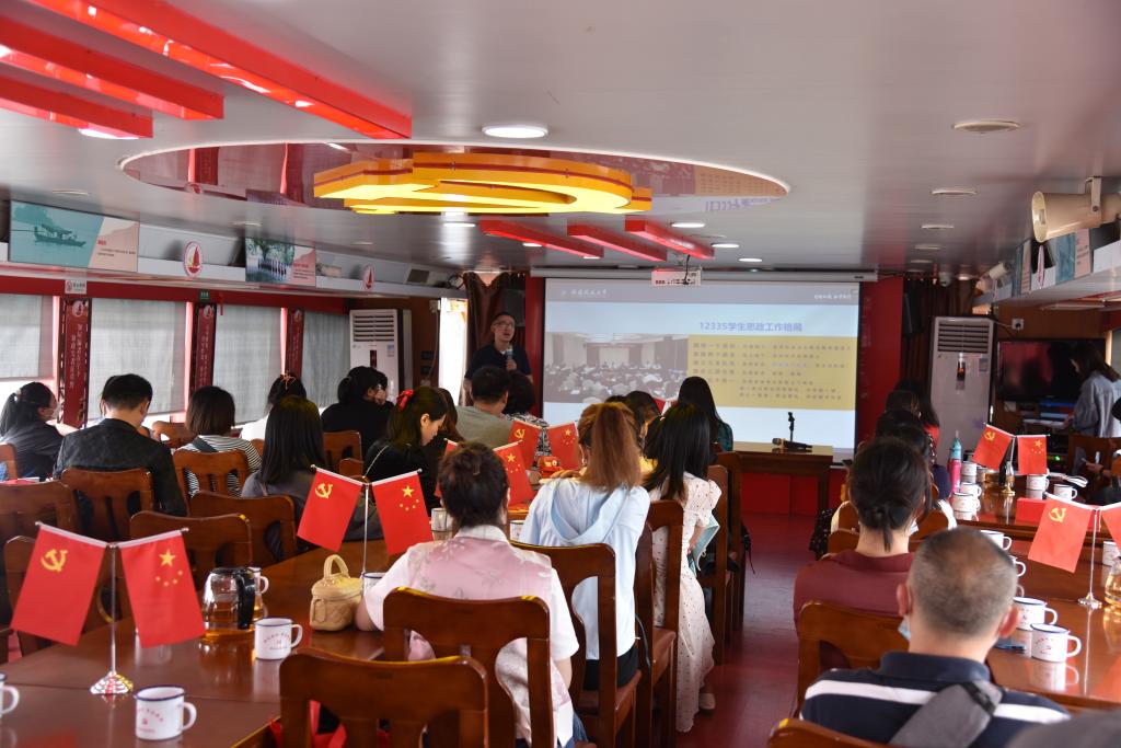 在回程的“红船”上,学院围绕“喜迎二十大,启航新征程”的主题开展了学生骨干培训。学院党总支副书记、副院长王妙真以“把青春播撒在民族复兴的新征程上”为主题,为学生网上党支部成员讲党课。王妙真从五四运动爆发讲起,带领同学们回顾了百年来青年觉醒和奋斗的历程,号召同学们接好民族复兴的接力棒,自强弘毅,励学敦行,做奋发有为的开大人。