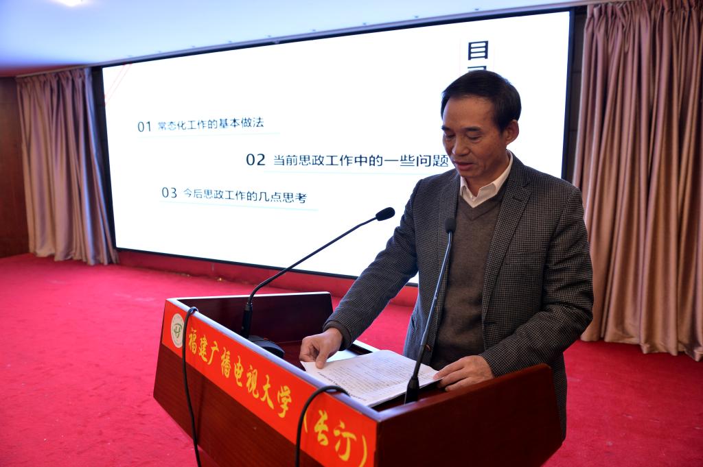 陈兴炎作题为《深入学习贯彻党的十九届五中全会精神,用心用情用劲做好学生思想政治工作》的讲话。他回顾总结了2019年学生思想政治工作会议以来学校落实“12335”新模式的情况,分析存在的问题和不足,并提出全力推进“12335”思政工作落地、落深、落实的六点意见:一要提高政治站位,深入学习宣传贯彻党的十九届五中全会精神,认真部署谋划党的创新理论成果“三进”工作。二要聚焦思想引领,加强顶层设计,以福建开放大学挂牌为契机,不忘初心、砥砺前行,勇担促进全民终身学习的新使命。三要强化统筹协同,形成思政工作强大合力。四要坚持改革创新,全力构建新型思政育人体系。五要突出育人导向,以科学评价促进思政工作质量提升。六要加强自身建设,不断提高思政工作的能力和水平。