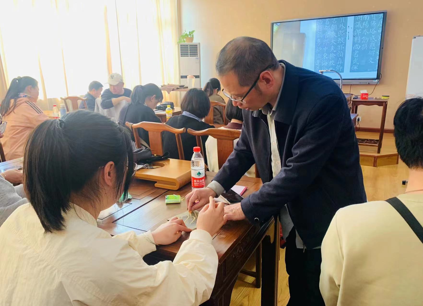 课后,中国书法家协会会员罗建辉现场点评学生书法作品,在内容形式、用墨钤印等方面进行逐一指导,并就如何进一步提高个人书法技艺给出专业性建议。
