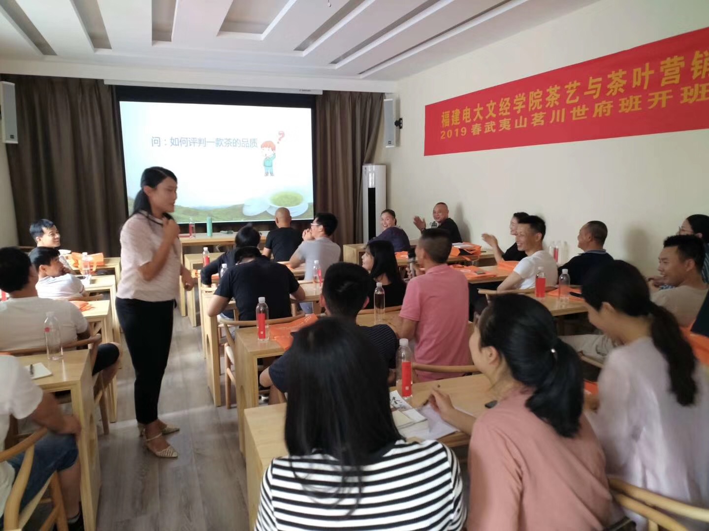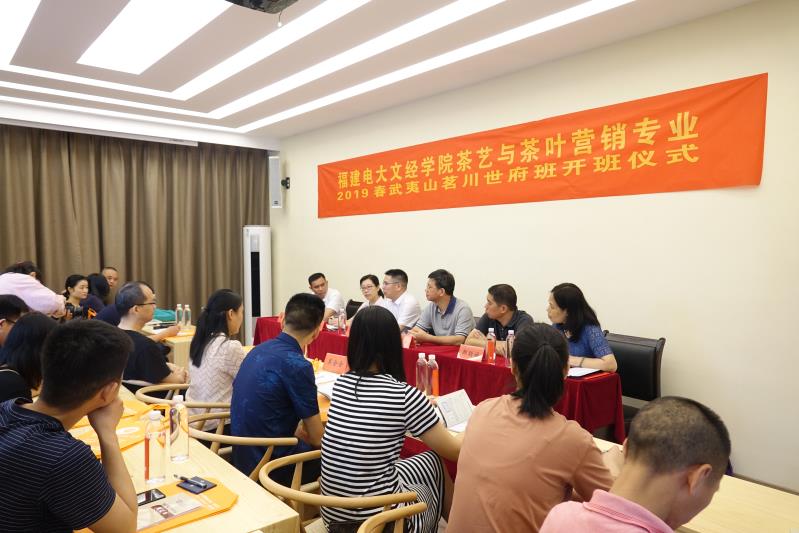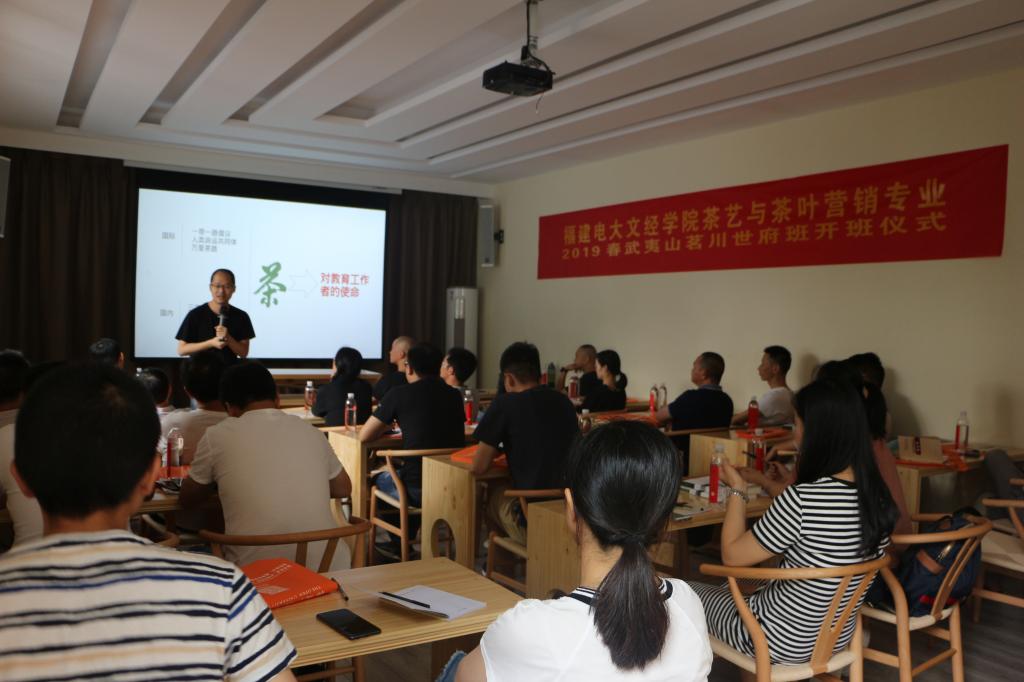 6月12日,文经学院组织茶学团队前往2019春茶艺与茶叶营销(茶叶审评与营销方向)专业武夷山茗川世府班送教授课,并举行开班仪式。为探索成人学生思想政治工作,学校党委副书记马成斌、武夷山市委副书记涂桦忠参加开班仪式。